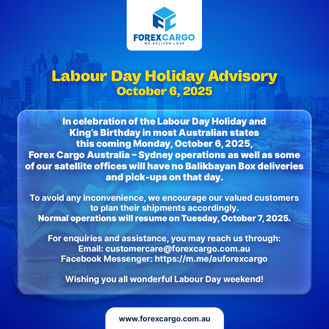 In celebration of the Labour Day Holiday and King’s Birthday in most Australian states this coming Monday, October 6, 2025, Forex Cargo Australia – Sydney operations as well as some of our satellite offices will have no Balikbayan Box deliveries and pick-ups on that day. To avoid any inconvenience, we encourage our valued customers to plan their shipments accordingly. […]